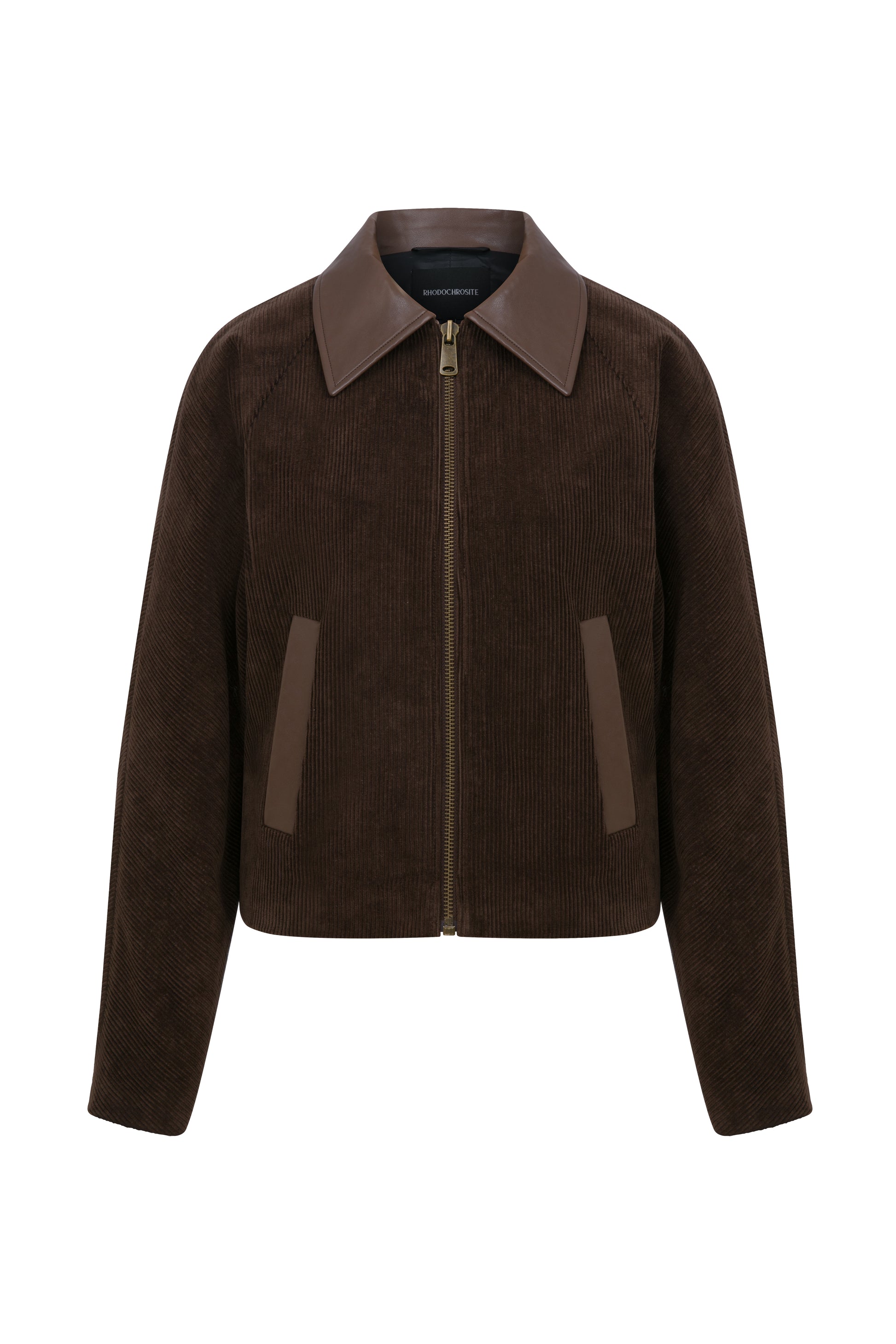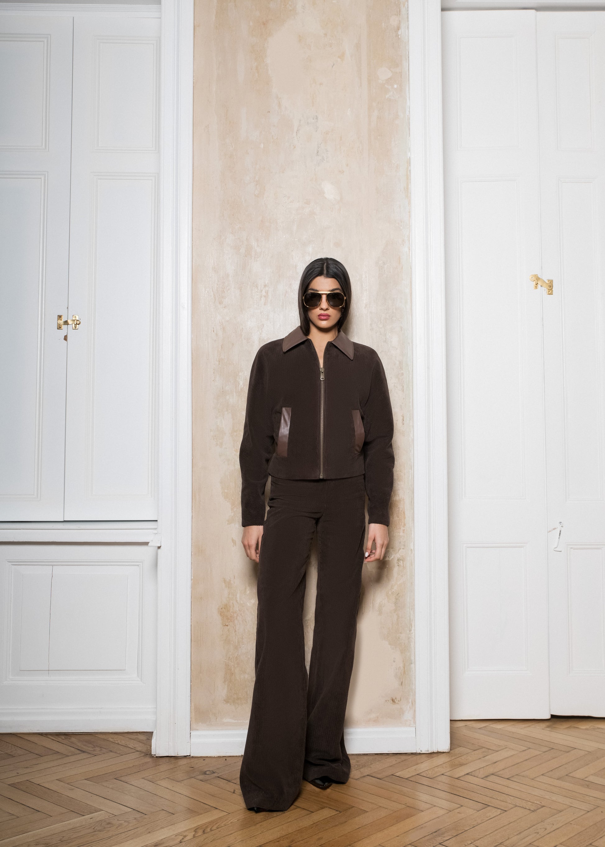 Deri yaka,deri flato cep detaylı kadife ceket.