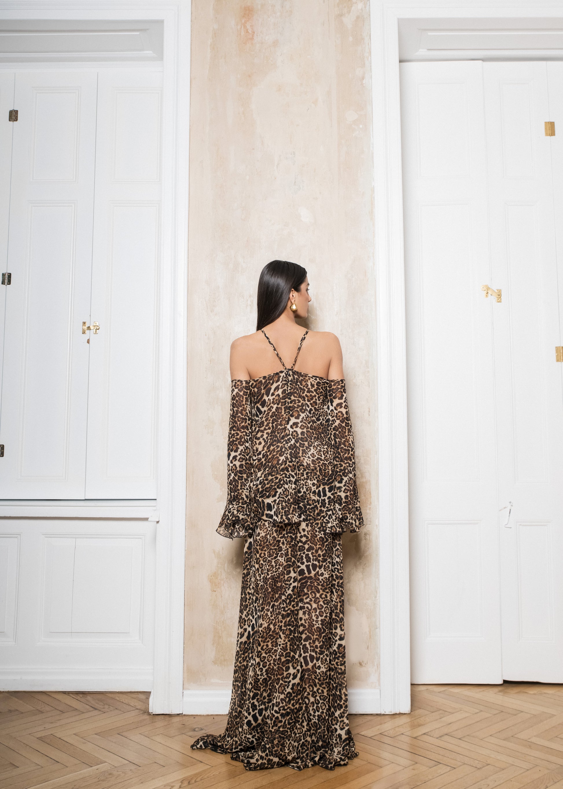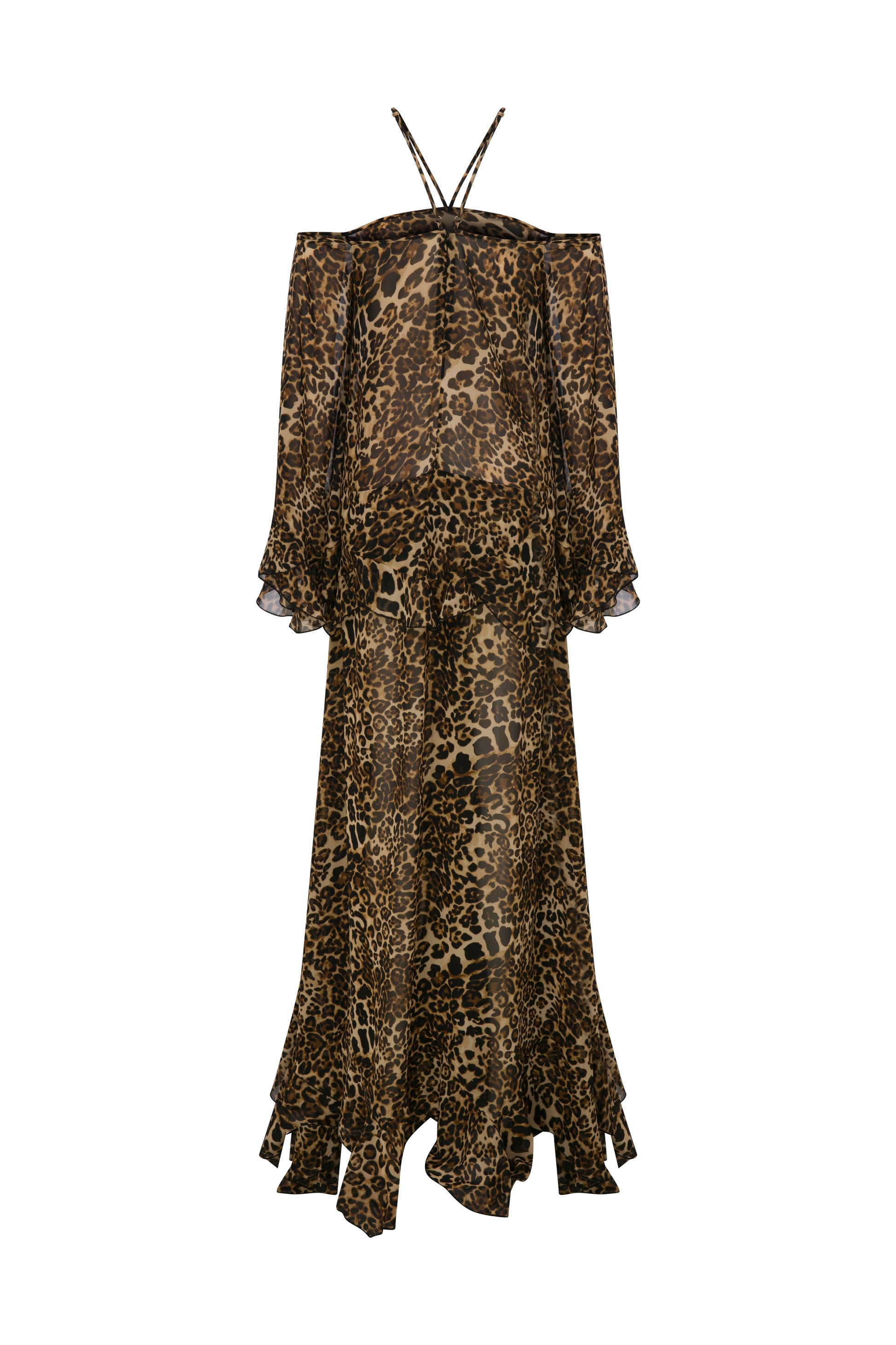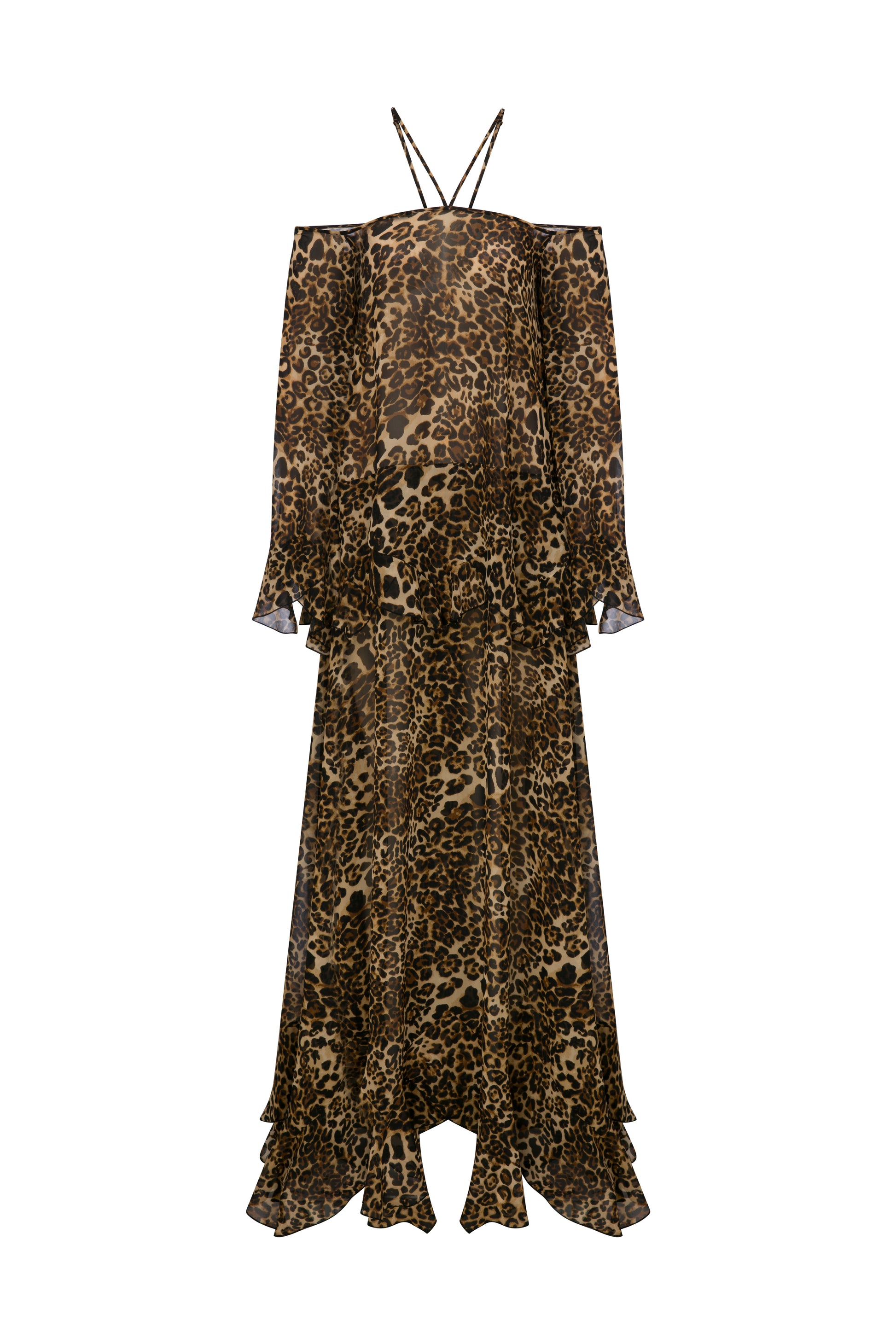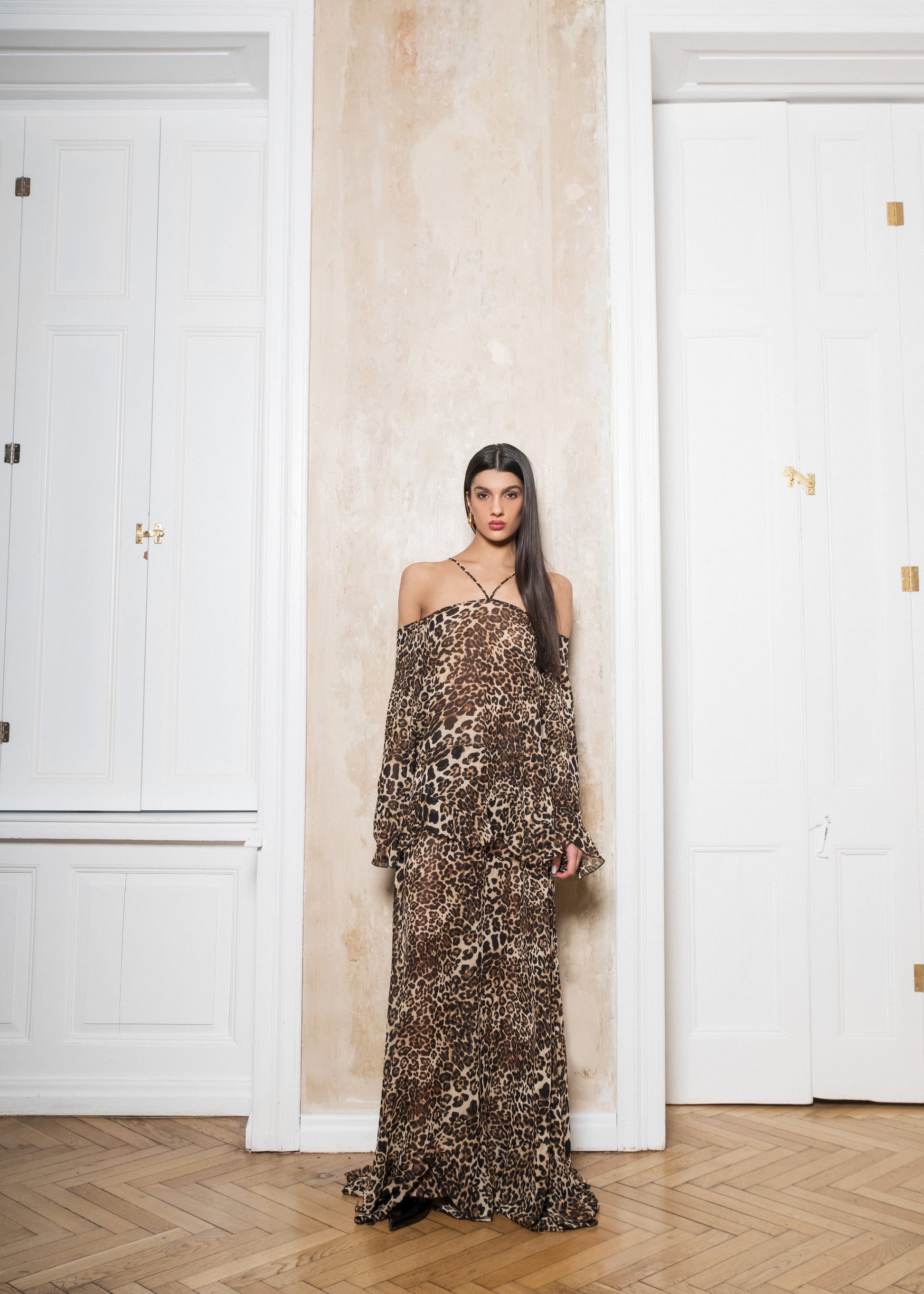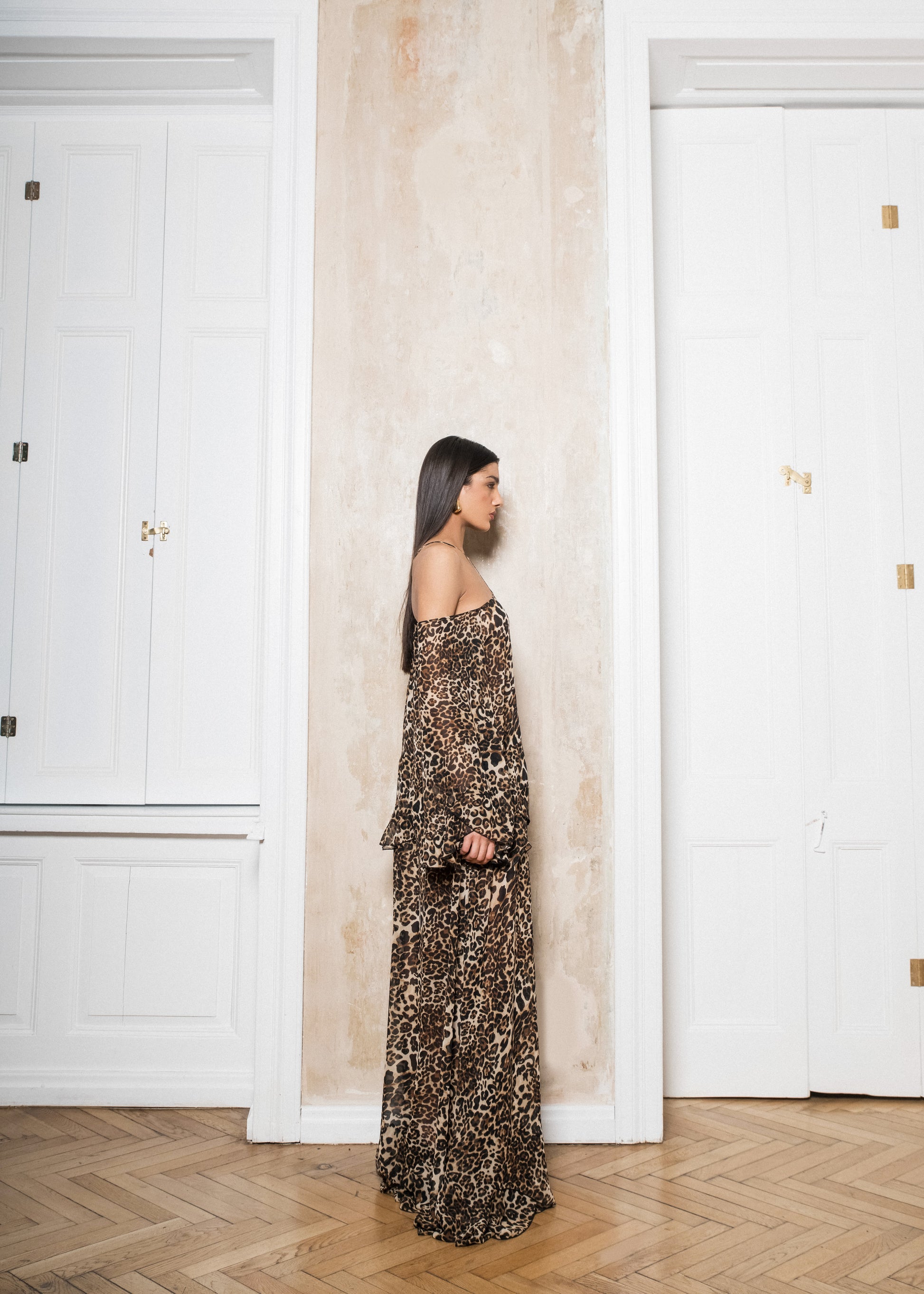 Yarı transparan görünümlü, düşük omuzlu, uzun elbise.