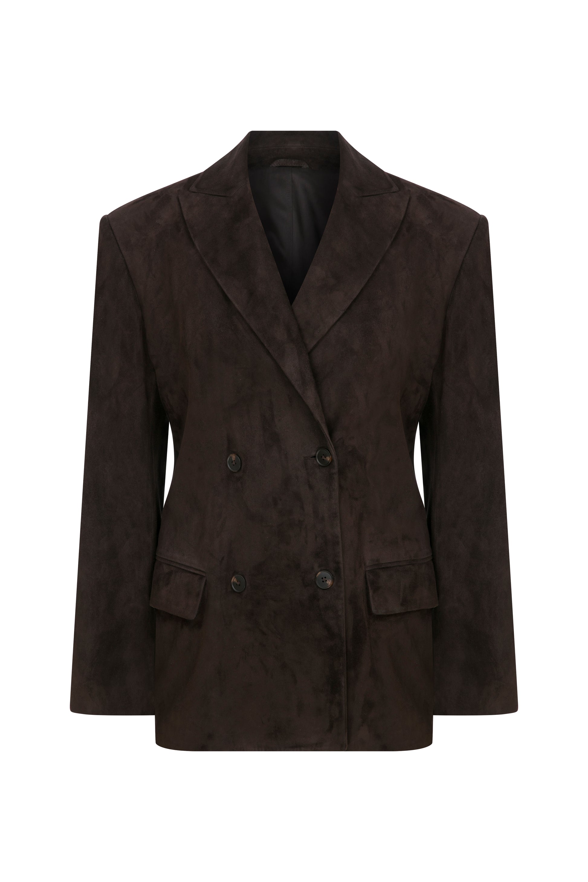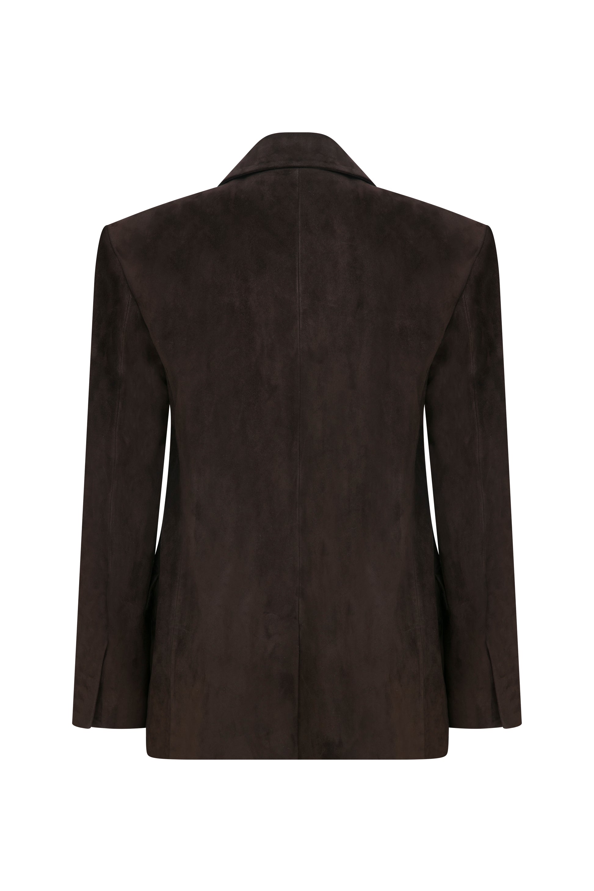 Büyük boy çift düğmeli süet blazer. keskin dolgulu omuzları ve sivri yakalarıyla çift düğmeli bir şekilde süetten dikilmiştir.