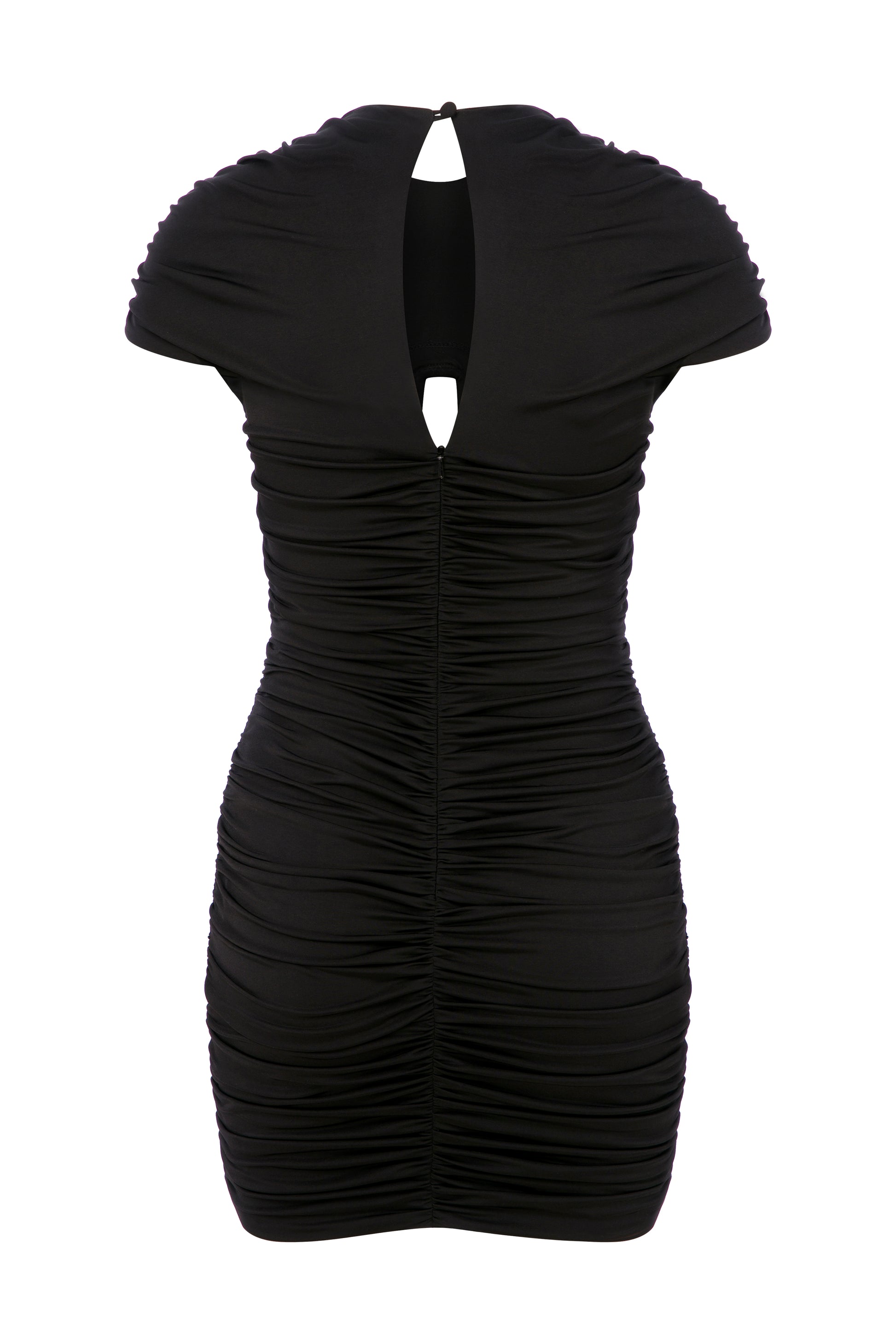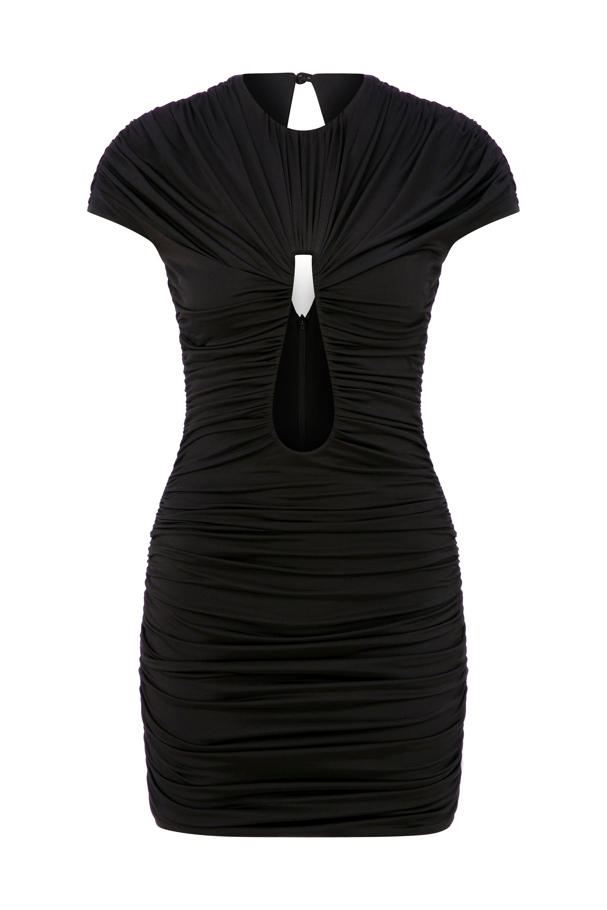 Göğüste tel detaylı, dekolteli mini drape elbise.