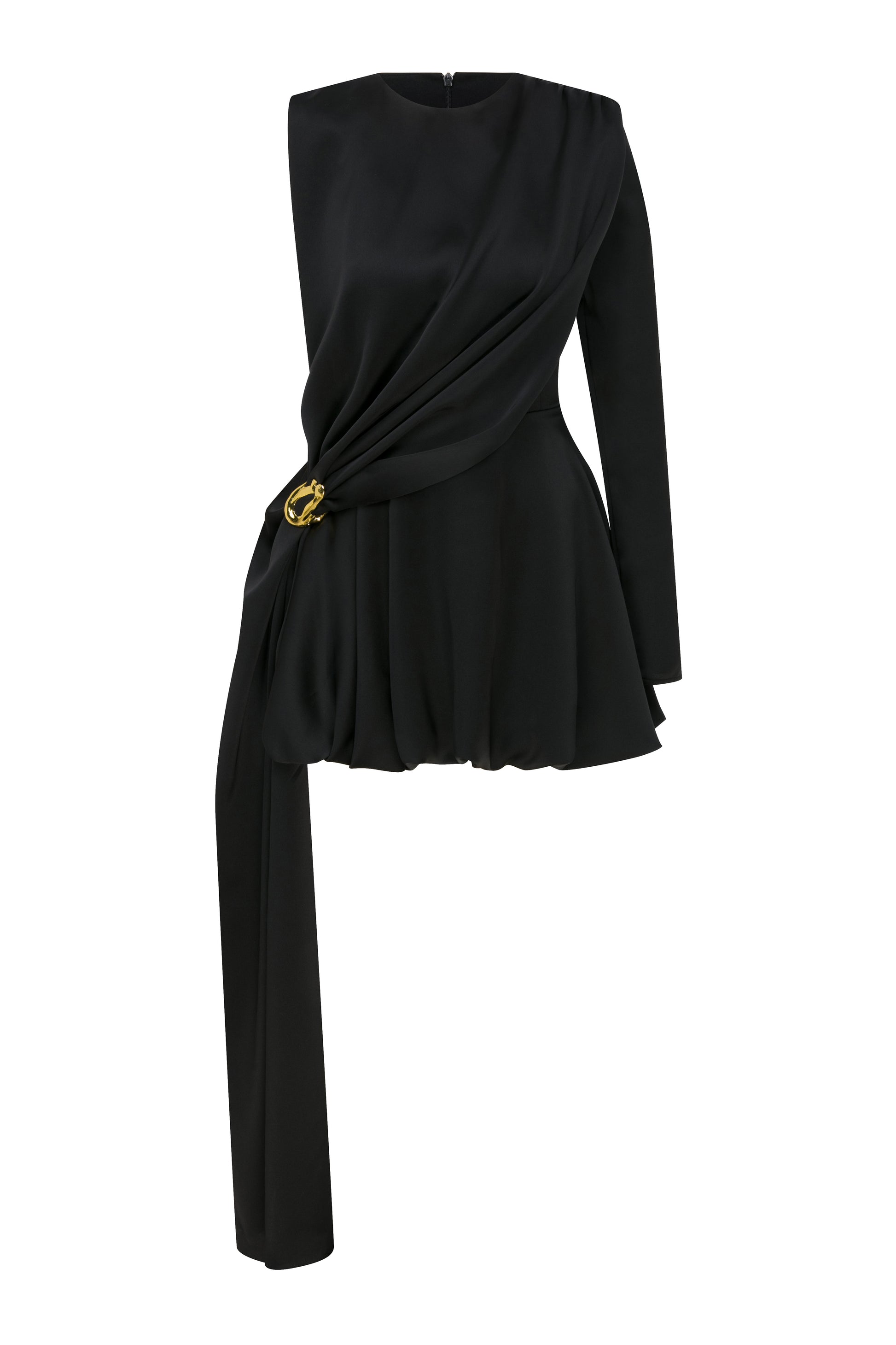 Tek kollu, asimetrik, gold aksesuarlı saten elbise.