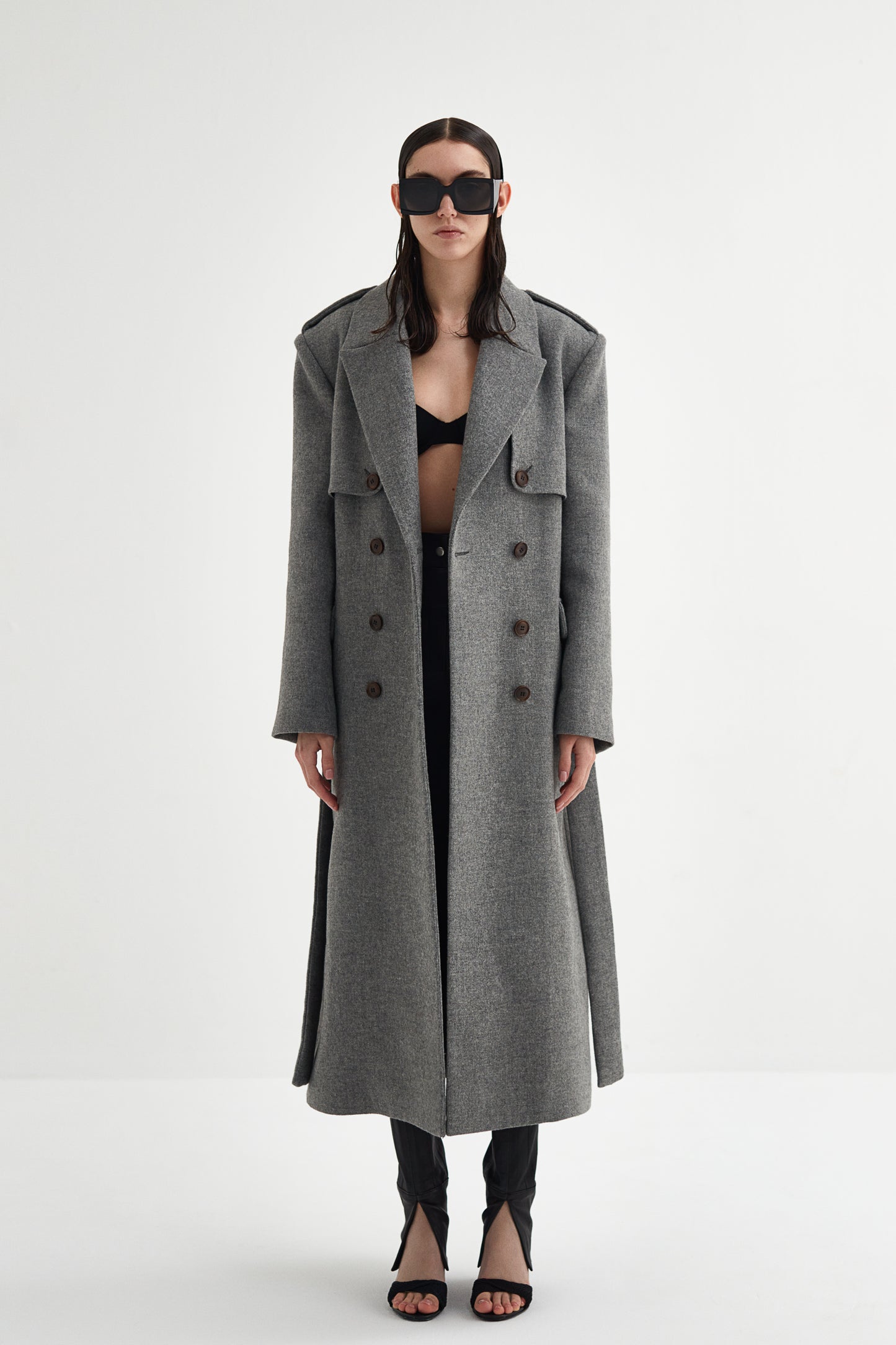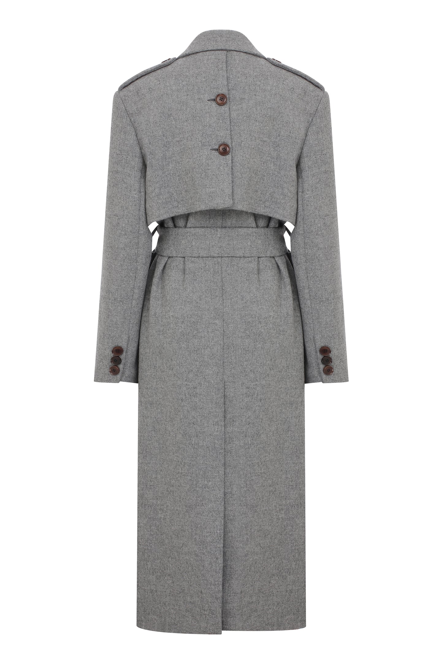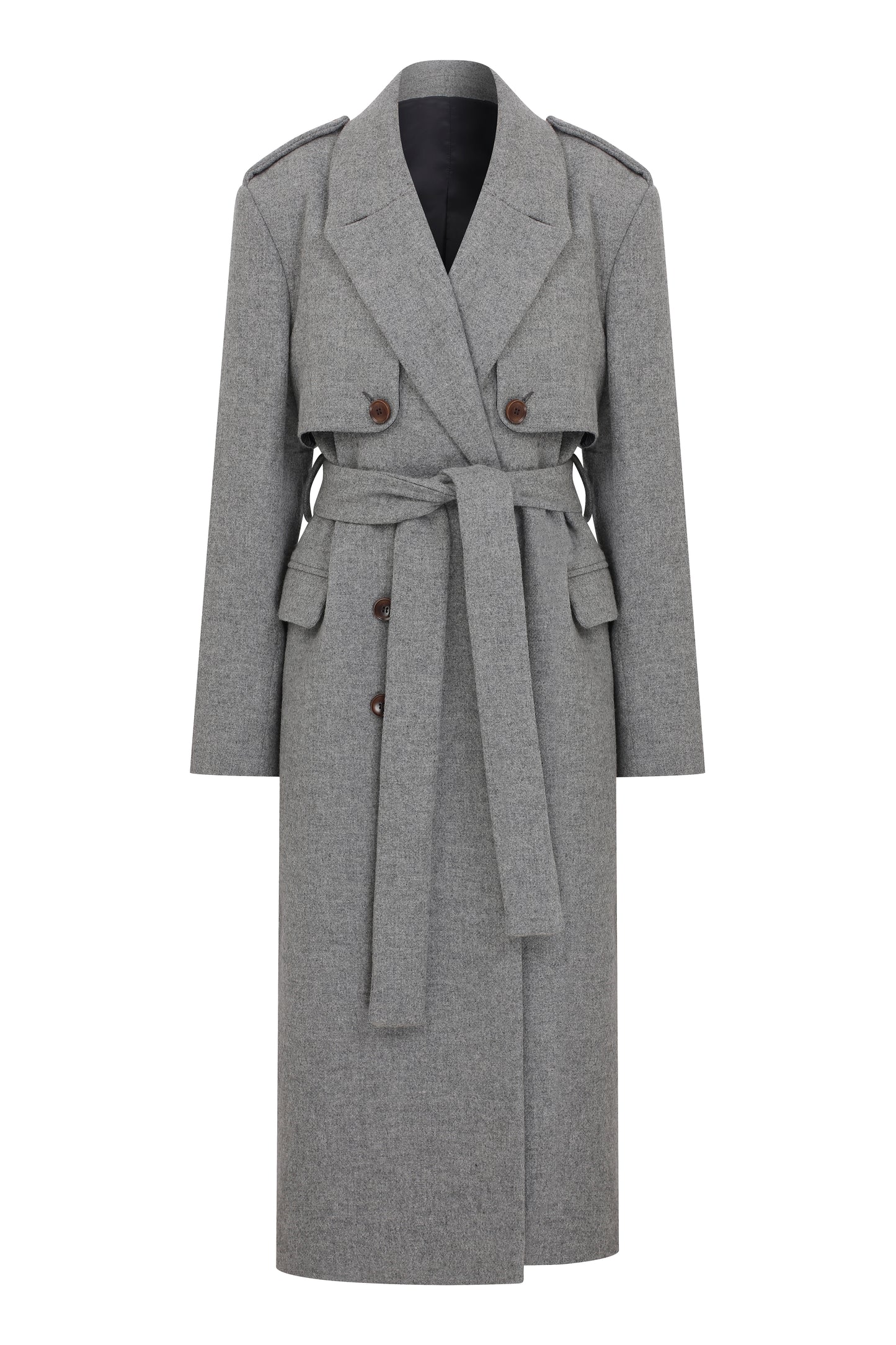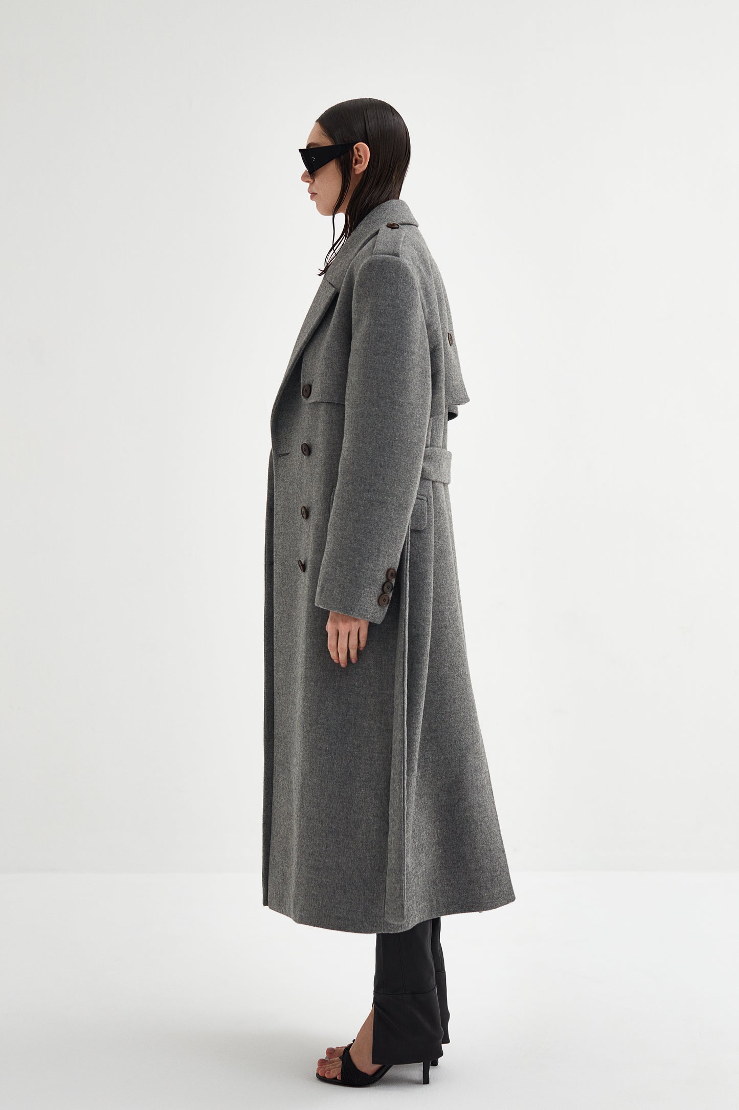 - Kruvaze yaka, beli kuşaklı yün kaban.
