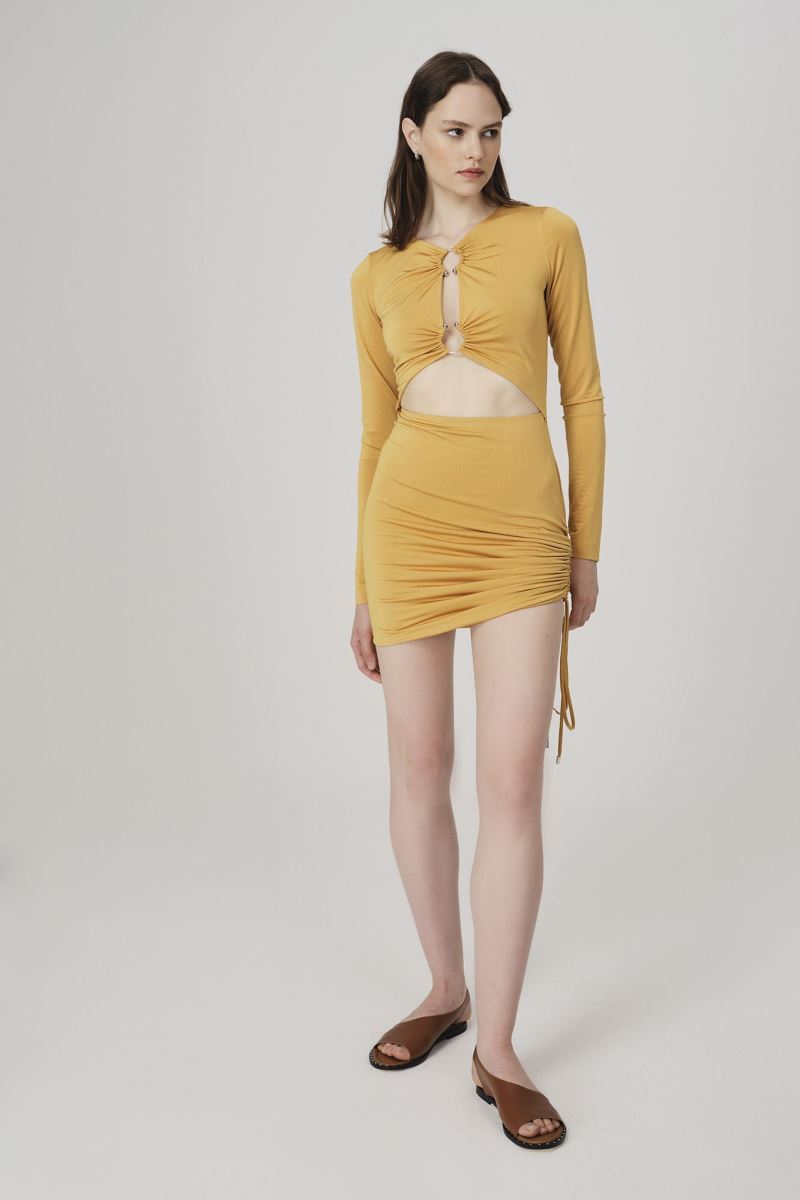 - Önü Metal Tokalı, Kesim Detaylı, Yanı Büzgülü, Mini Elbise
