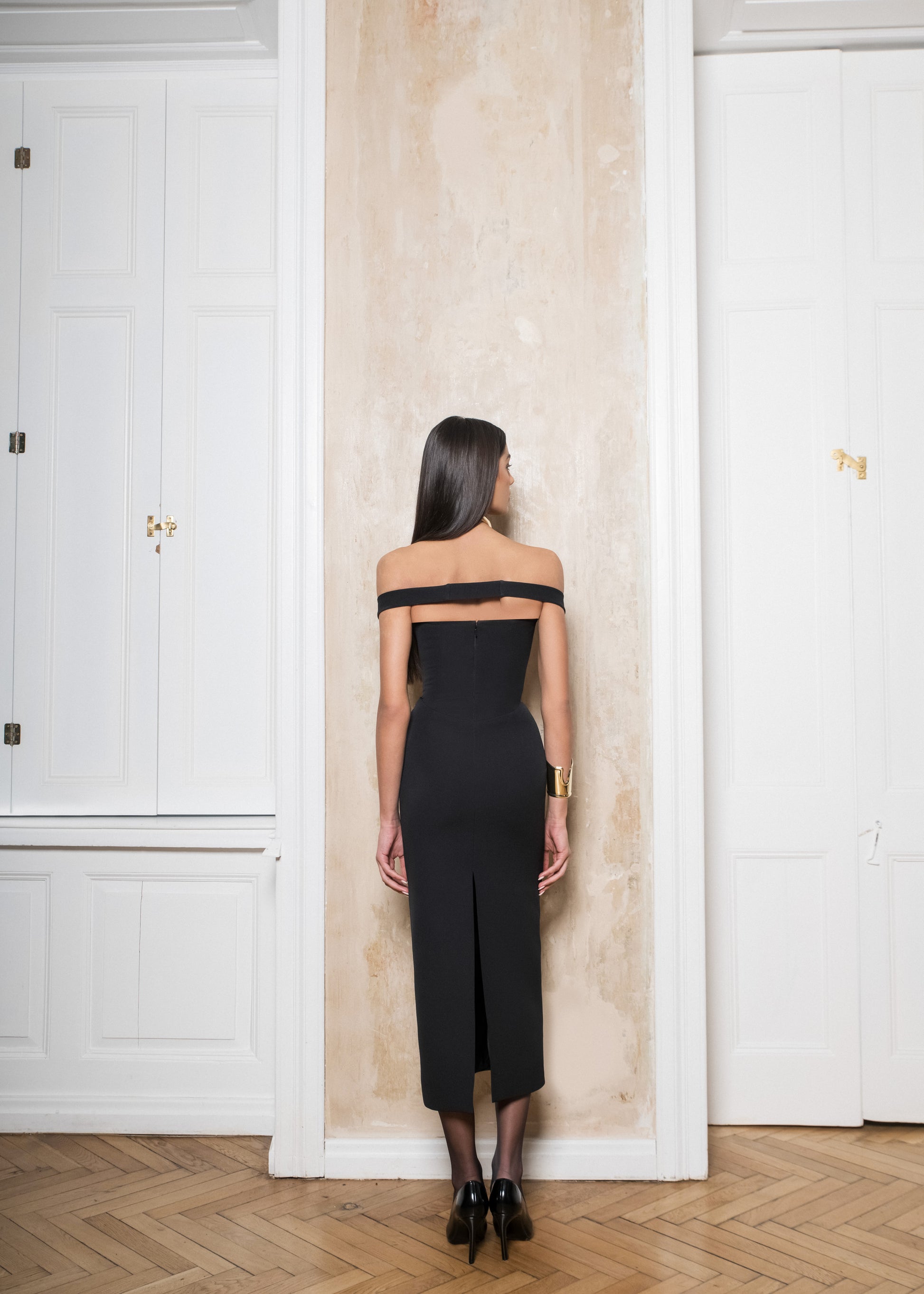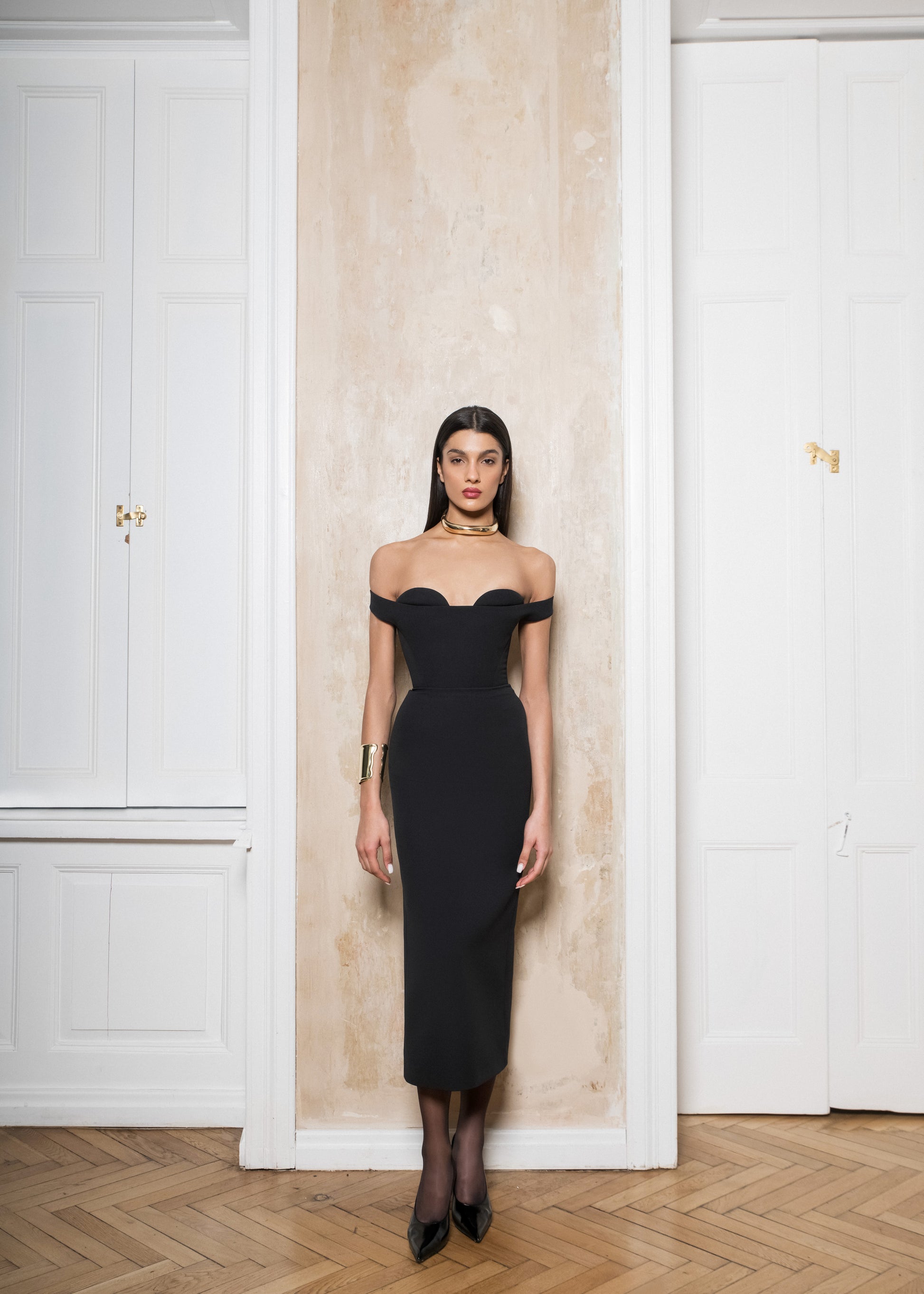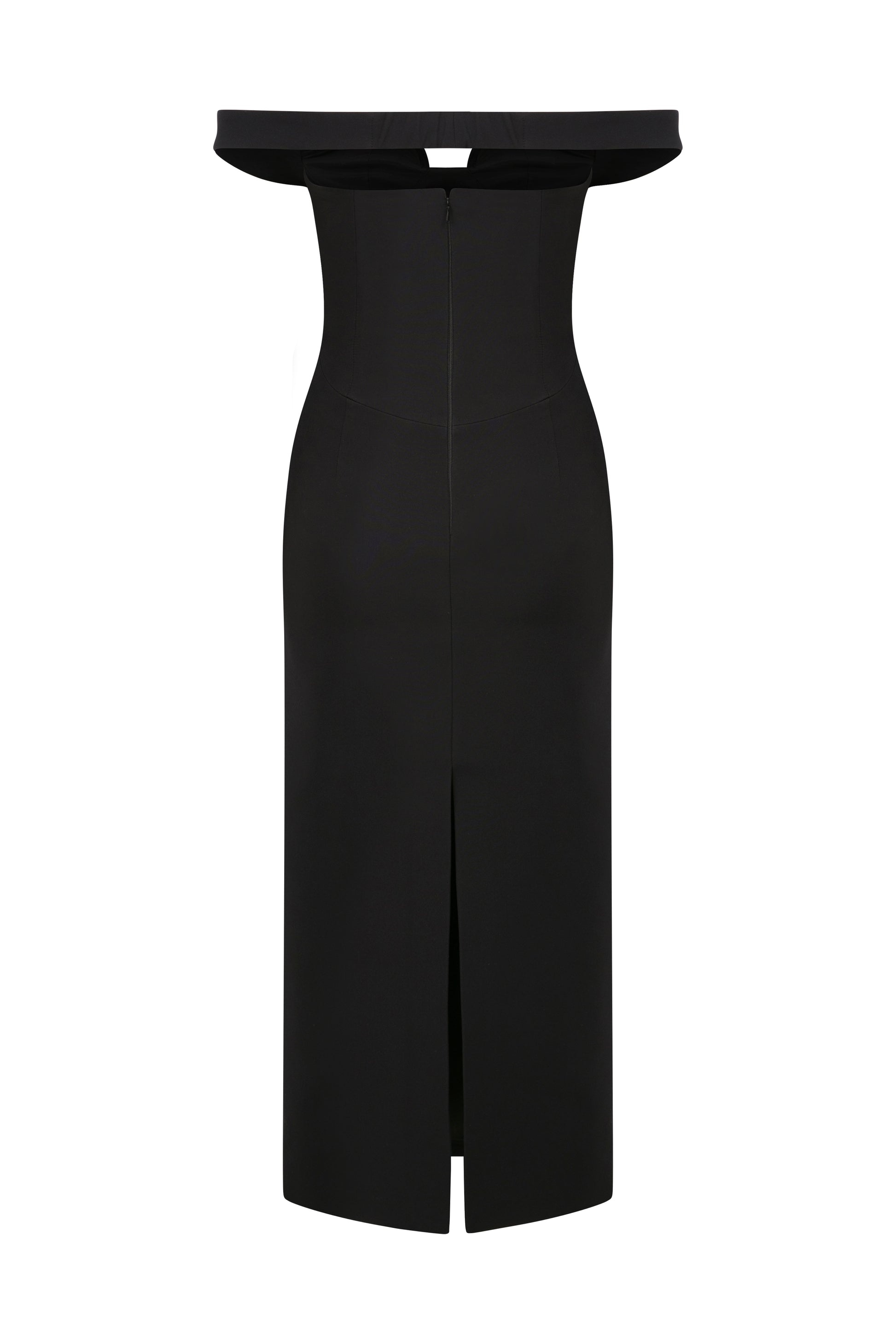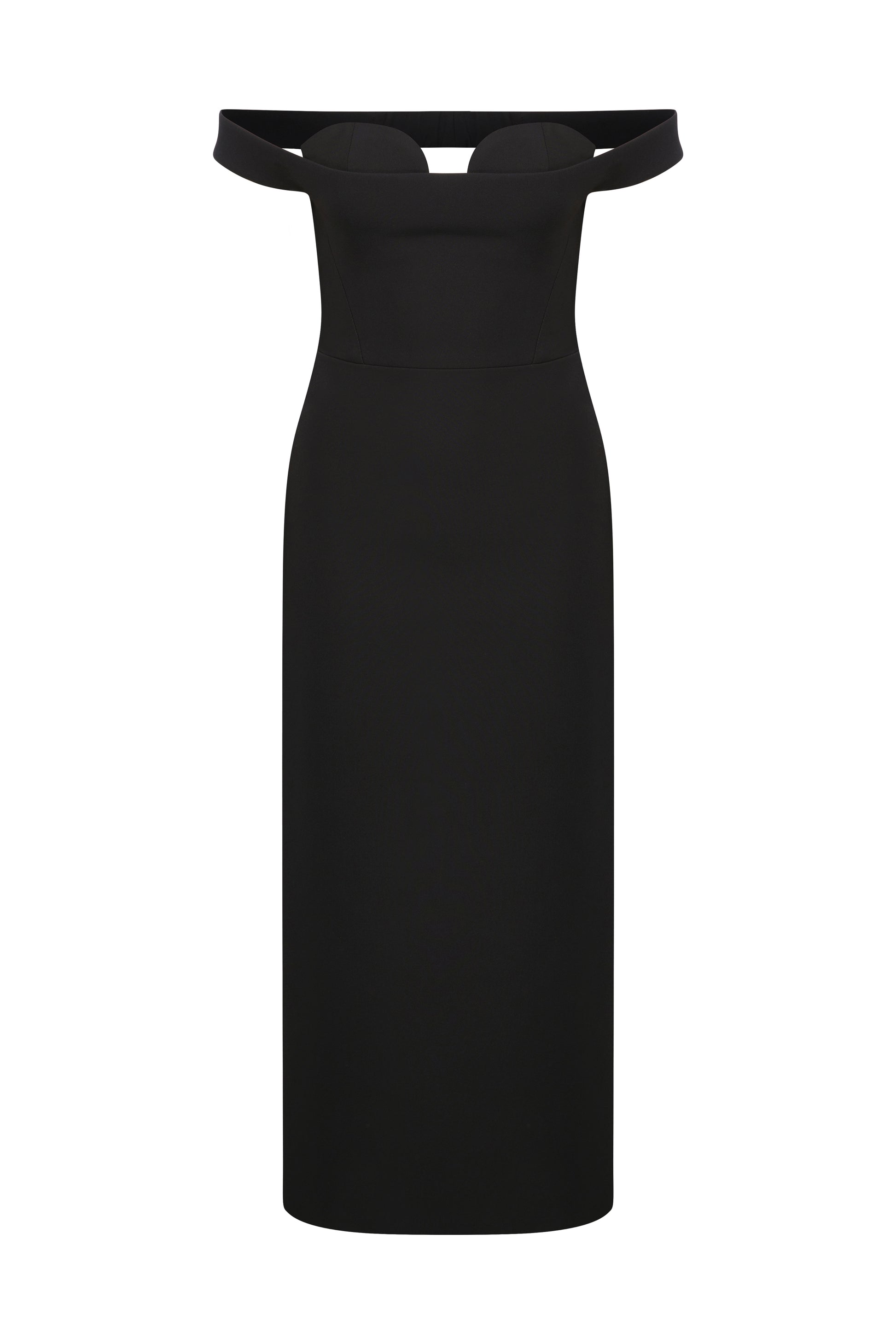 İnce askılı, düşük omuz kalp yaka detaylı elbise.