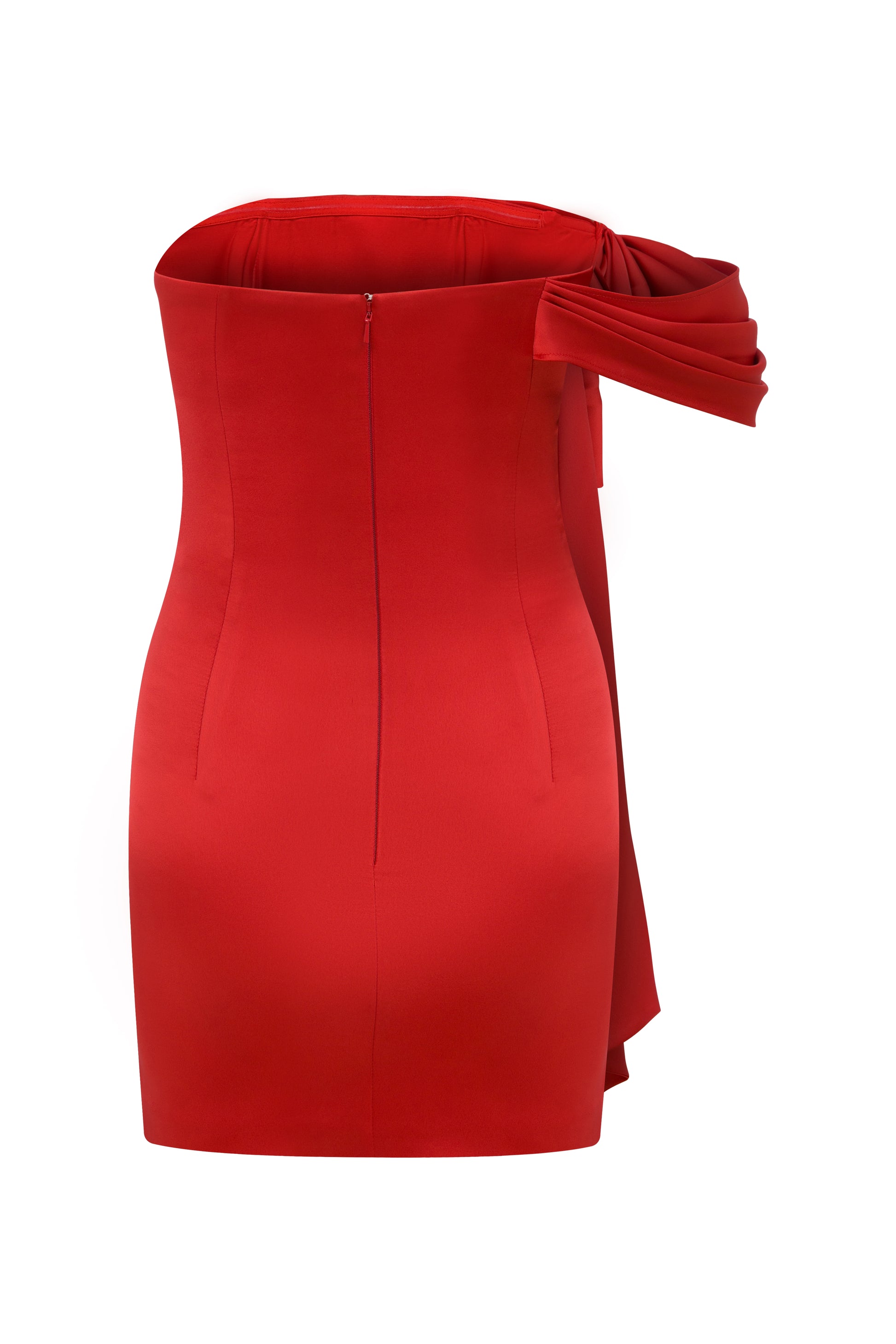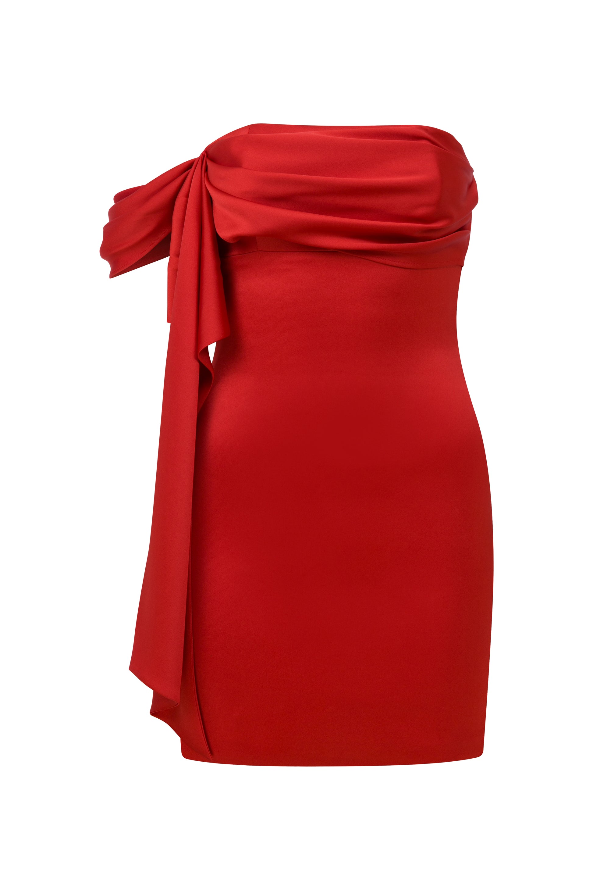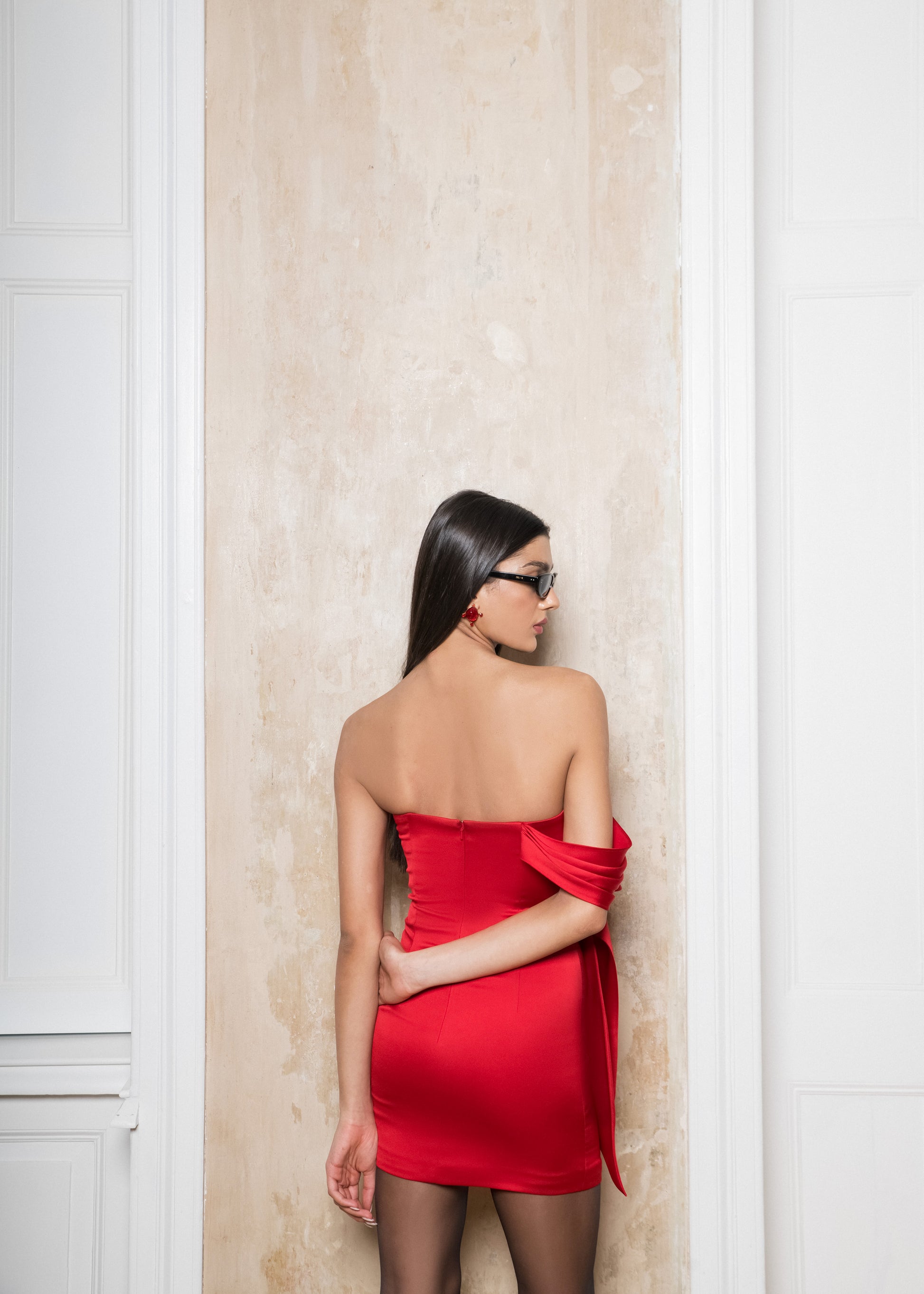- Düşük omuz detaylı drapeli, asimetrik mini elbise.
