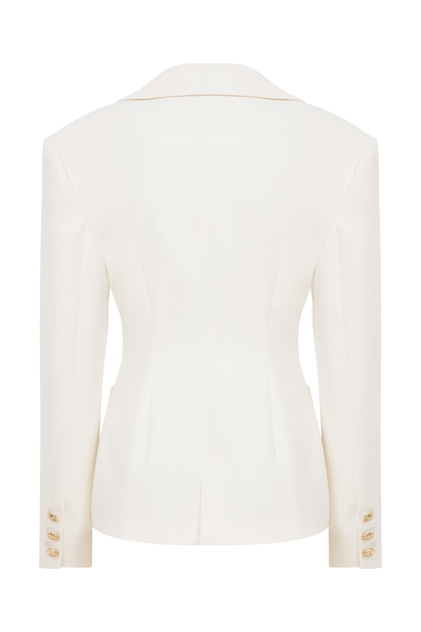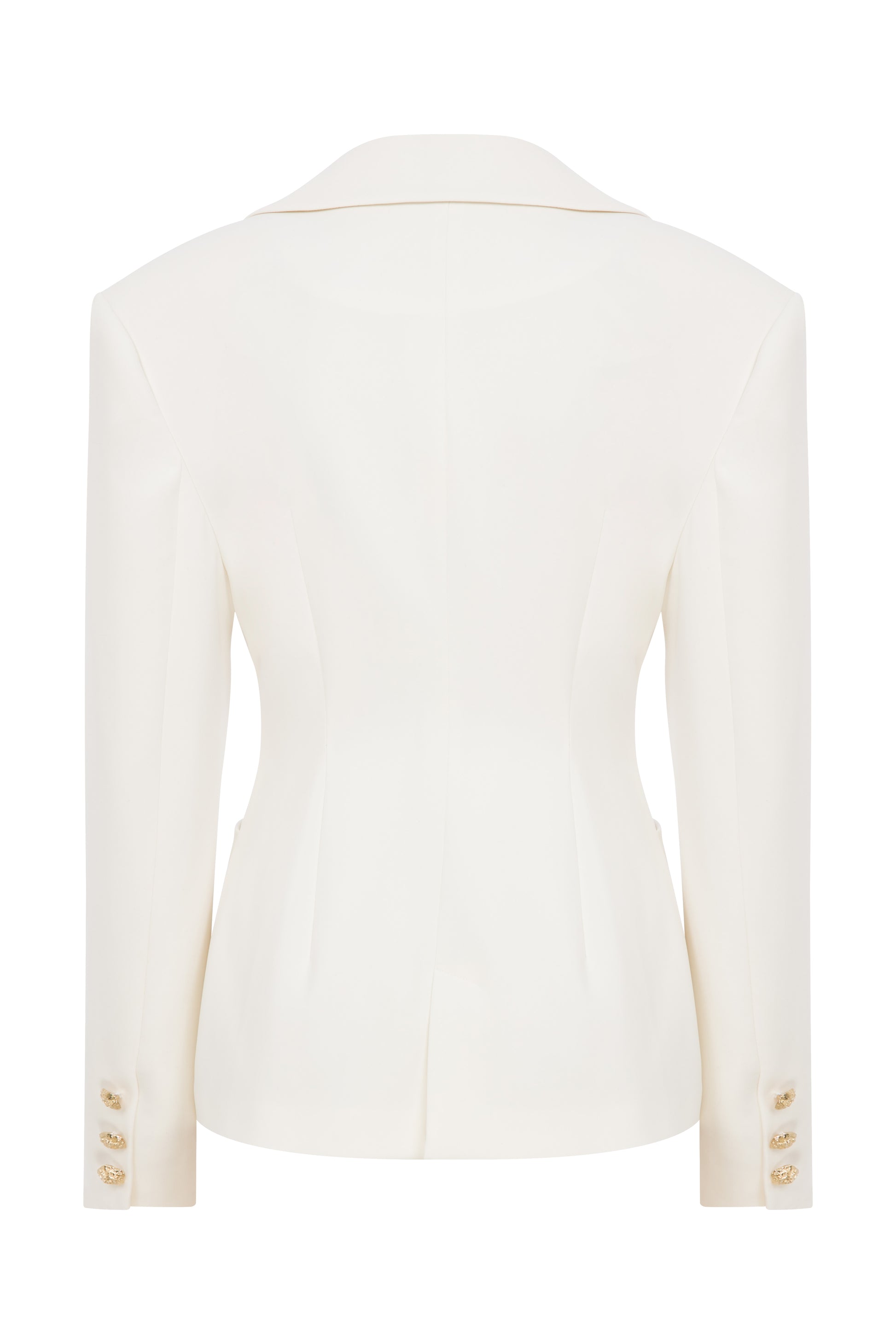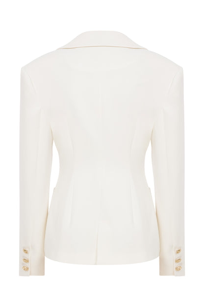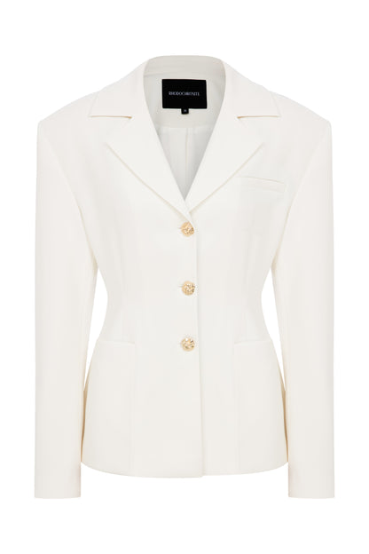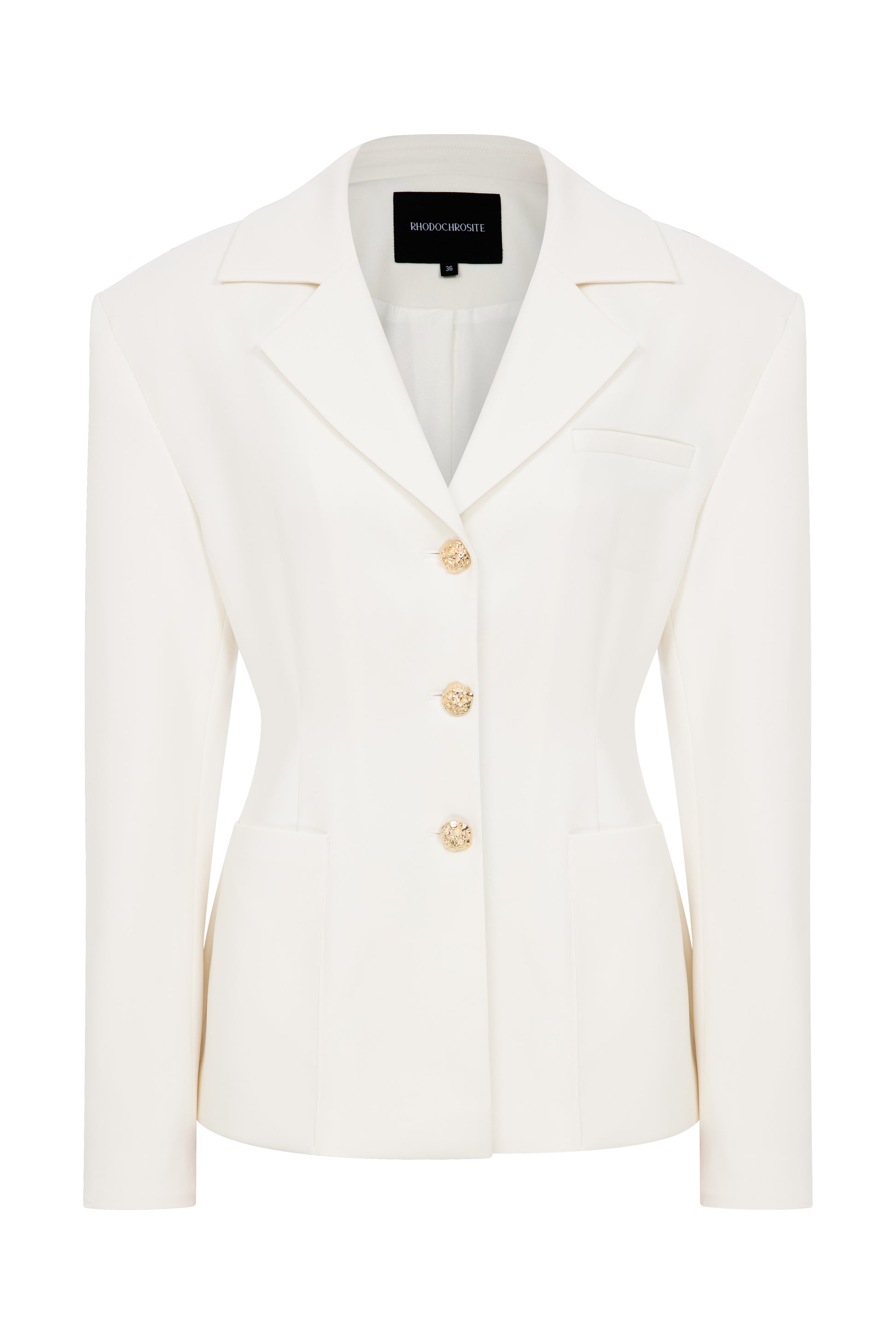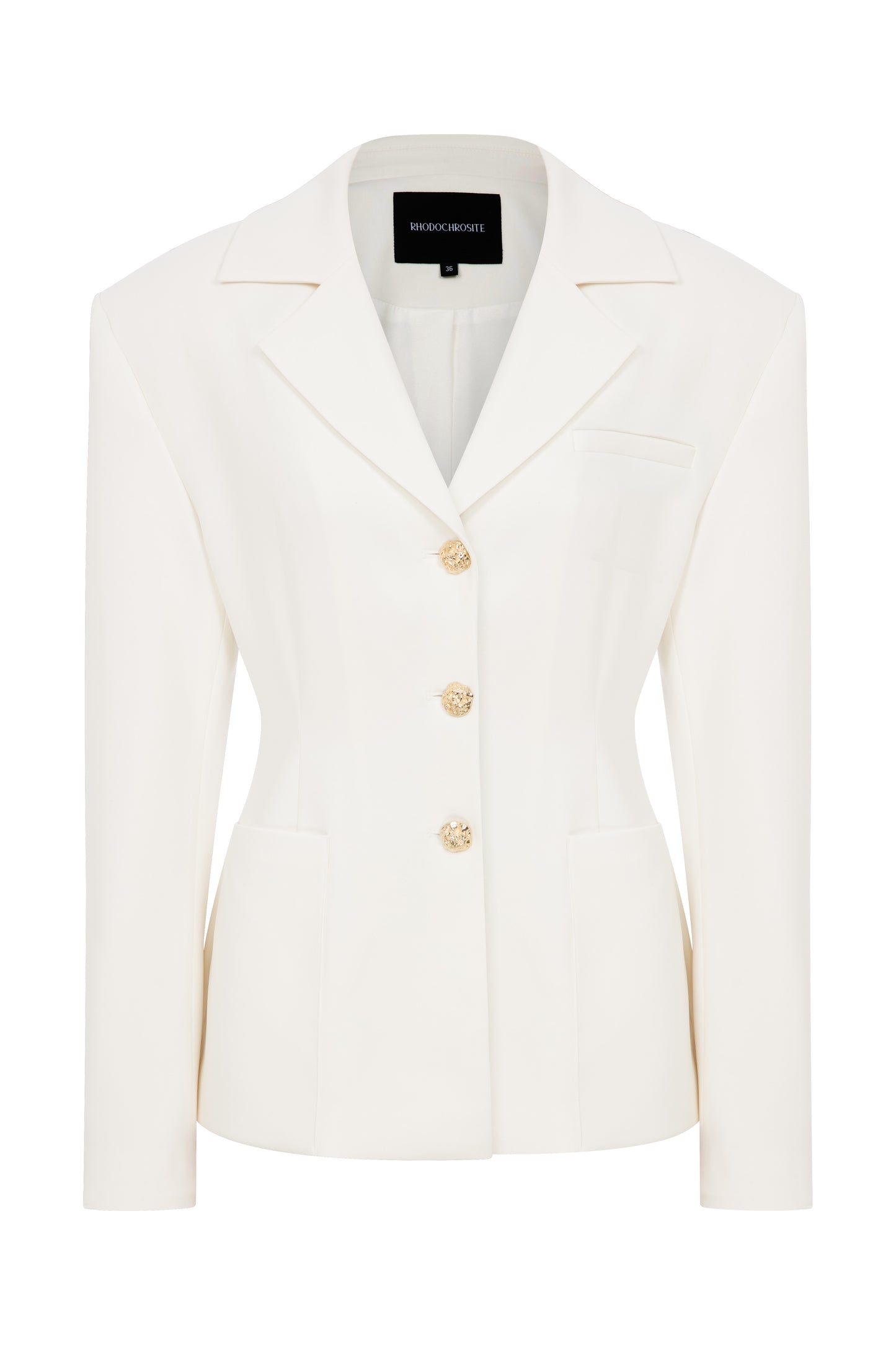 Kum saati silüet, omuzlarda vatka detaylı, gold düğmeli blazer.