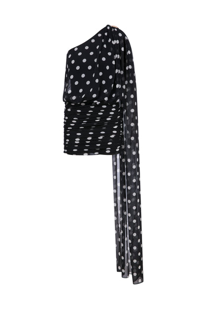 Tek omuzlu, asimetrik, omuzda aksesuar detaylı şifon elbise.