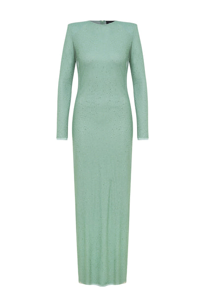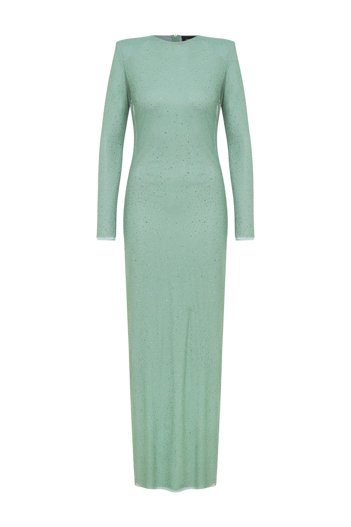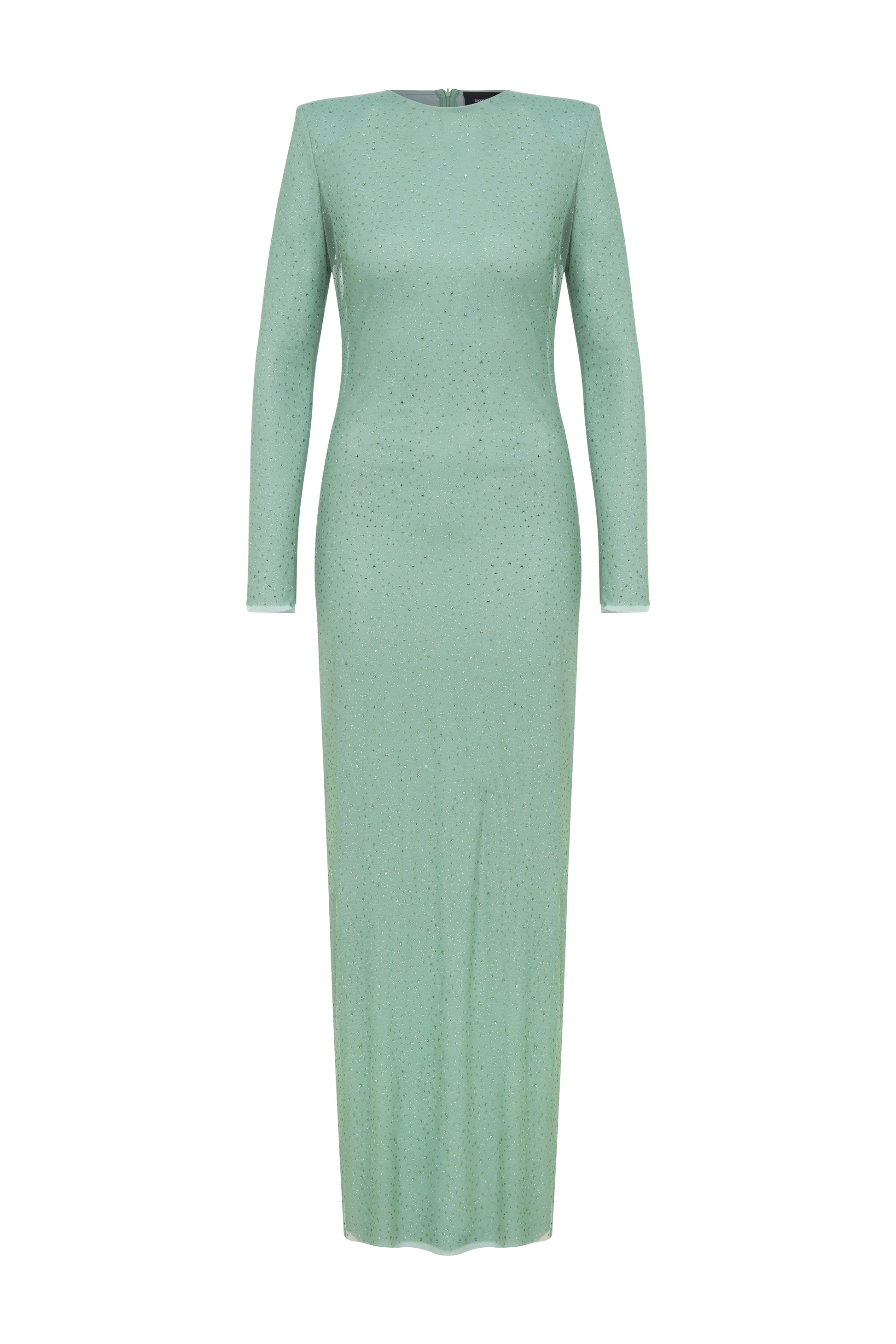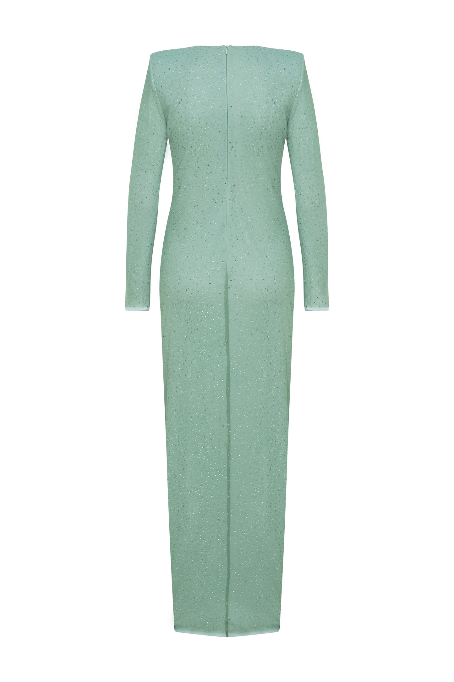 Tek kollu, asimetrik, gold aksesuarlı şifon elbise.
